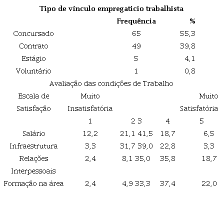 Conforme Tabela 2, mais da metade são trabalhadoras(es) concursadas(os) (55,3%), seguido de trabalhadoras(es) em regime contratual (CLT) (39,8%) e uma minoria em vinculação voluntária ou de estágio (4,9%). Quanto à satisfação com as condições de trabalho, a maior frequência (41,5%) encontra-se num ponto mediano, nem muito satisfatório ou insatisfatório, ocorrendo o mesmo para o salário e a infraestrutura (39,0%). Já para a formação na área (37,4%) e relações interpessoais (35,8%), as frequências de resposta expressam maior satisfação.
