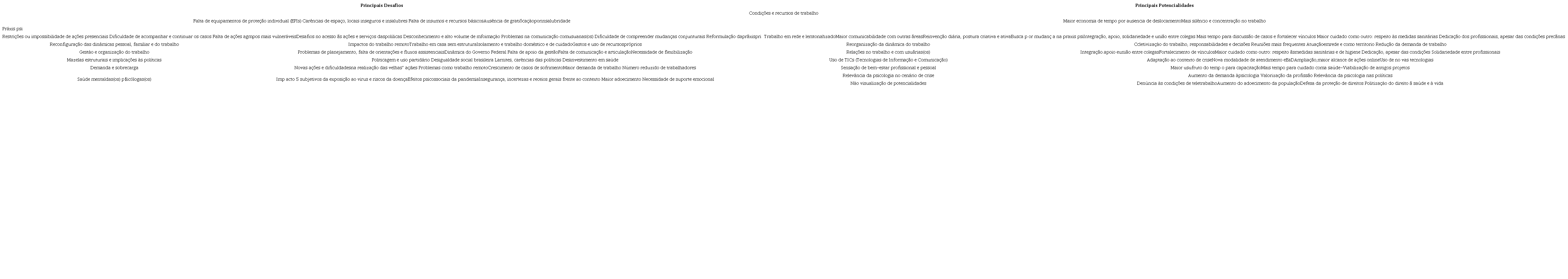 A Tabela 3 condensa categorias e subcategorias de análise. Sobre os desafios, as respostas foram categorizadas da seguinte forma: condições e recursos de trabalho; gestão e organização do trabalho; mazelas estruturais e implicações às políticas; práxis psi; reconfiguração das dinâmicas pessoal, familiar e do trabalho; demanda e sobrecarga; e saúde mental das(os) psicólogas(os).