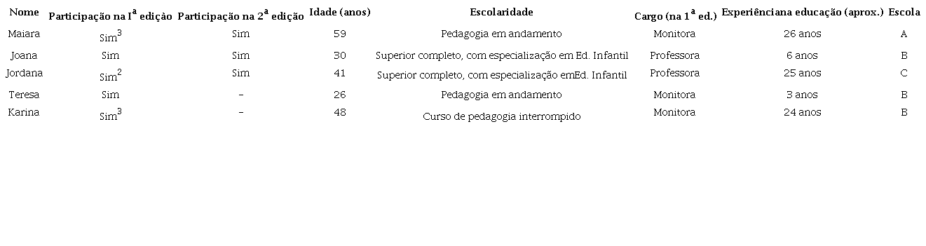 Participaram do estudo cinco educadoras que atendiam bebês e crianças pequenas em turmas de berçário e maternal de três escolas da rede municipal de Educação Infantil de Porto Alegre/RS. As educadoras participaram de duas edições do GDT, que foi inspirado no modelo proposto pela Clínica Tavistock (Elfer, 2012): a primeira edição, realizada em novembro de 2018, contou com a participação de cinco educadoras, e a segunda, ocorreu em junho de 2019, com a presença de três educadoras que haviam comparecido na edição anterior. Na primeira edição do GDT, as profissionais tinham idades entre 26 e 59 anos e diferentes níveis de escolaridade,dados que se encontram detalhados na Tabela 1. Os bebês e as crianças pequenas atendidos pelas educadoras na primeira e na segunda edição dos grupos tinham idades entre 6 meses e 3 anos e 6 meses. Cabe ressaltar que as educadoras trouxeram relatos relativos a diferentes momentos da experiência profissional, não fazendo referência apenas às crianças atendidas no momento das duas edições do GDT. As educadoras participaram de um estudo maior, intitulado “Inclusão de bebês com deficiência - Projeto Incluir”, a partir do qual foram convidadas para os encontros do GDT.