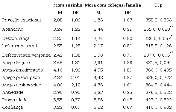 Pode-se observar a partir da Tabela 1 diversas diferenças estatisticamente significativas entre os dois grupos a partir do teste U de Mann-Whitney. Nos EIDs observou-se diferenças nos esquemas de abandono (U= 265,0; p=0,020), desconfiança (U=280,0; p=0,037), defectividade (U=237,0; p=0,005). Em todas essas variáveis, as médias foram mais altas no grupo de quem mora sozinho, indicando que esses esquemas estão mais ativos nesse grupo.