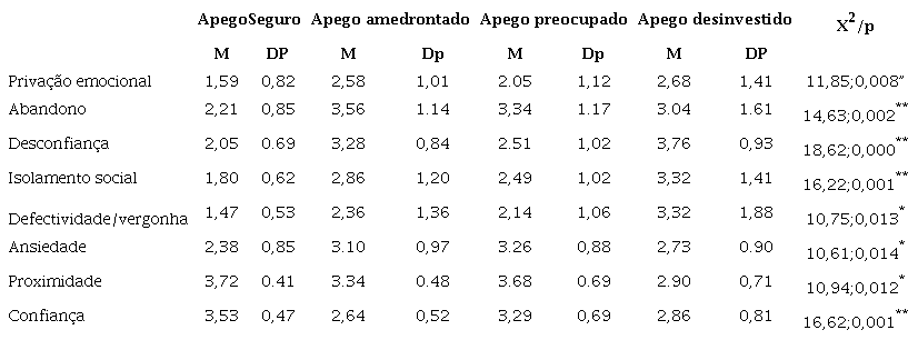 A Tabela 2 mostra a comparação por estilo de apego relatado. Importantes diferenças foram reconhecidas em vários esquemas. O estilo de apego Desinvestido teve os escores mais altos nos esquemas de Privação Emocional (X2=11,85; p=0,008), Desconfiança (X2=18,62; p=0,001), Isolamento (X2=18,62; p=0,001), Defectividade (X2=10,75; p=0,013). Nesses esquemas, o estilo Amedrontado foi o segundo mais alto. Na variável de Abandono (X2=14,63; p=0,002) a maior média foi do estilo Amedrontado. O estilo de apego seguro teve a menor pontuação em todos os esquemas.