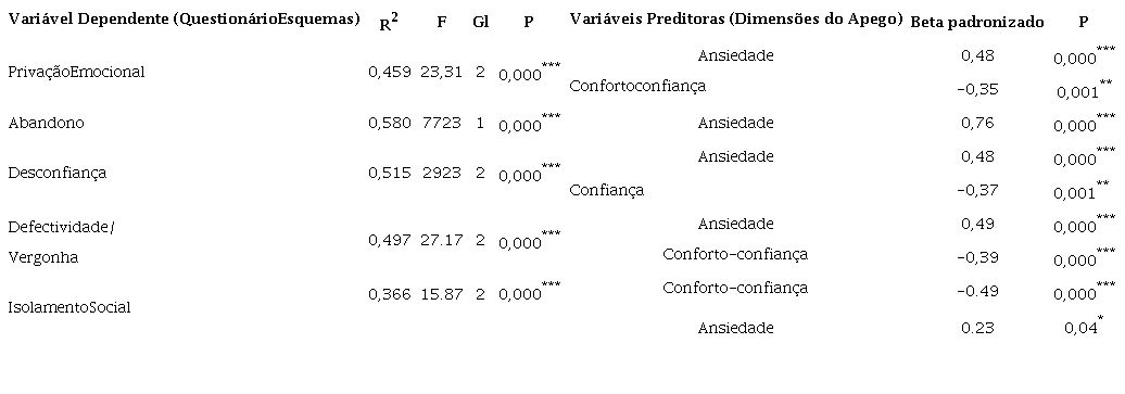 Essa regressão múltipla tem como variáveis independentes as características de apego (Ansiedade, conforto-confiança, confiança e proximidade) e variáveis dependentes os esquemas iniciais desadaptativos do primeiro domínio esquemático. Todas as variáveis dependentes tiveram alguma relação significativa com as variáveis preditoras. Os resultados apontaram para coeficientes de determinação (R2) variando de 0,37 a 0,59, ou seja, as variáveis do apego explicaram de 37% a 59% da variância total do esquema testado. Nos modelos de predição formulados na presente pesquisa, os valores negativos encontrados dos coeficientes de regressão padronizado variaram de -0,26 a -0,39, enquanto os valores positivos variaram de 0,48 a 0,76, indicando valores representativos. Encontrou-se que a ansiedade tem uma predição significativa das variáveis dependentes de privação emocional, abandono, desconfiança, defectividade e fracasso. A variável independente de conforto-confiança influencia inversamente o coeficiente de regressão das variáveis dependentes e privação emocional e defectividade. Também foi identificado que a confiança influencia inversamente o esquema de desconfiança.