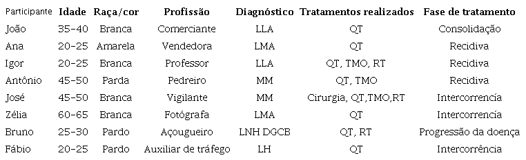 A amostra por conveniência foi composta por oito pacientes com diagnóstico de câncer hematológico, assistidos pelo Serviço de Hematologia, de uma unidade hospitalar de alta complexidade do Sistema Único de Saúde (SUS), responsável pelo tratamento de diversas doenças da área oncológica. Os critérios de inclusão foram: sujeitos adultos (maiores de 18 anos), de ambos os sexos, internados na enfermaria de Hematologia, apontados pela equipe como cientes de seu diagnóstico de câncer hematológico, e que já tivessem passado por, no mínimo, uma internação no respectivo hospital. Foram excluídos os sujeitos que estavam sendo atendidos pela pesquisadora, além dos que apresentavam evidência de prejuízo cognitivo e/ou capacidade de fala prejudicada ou que não estivessem com condições clínicas favoráveis para a realização da entrevista.