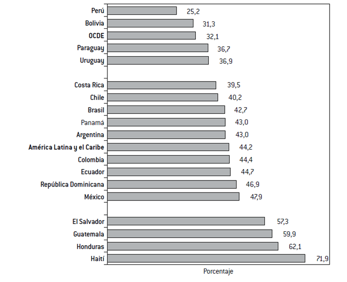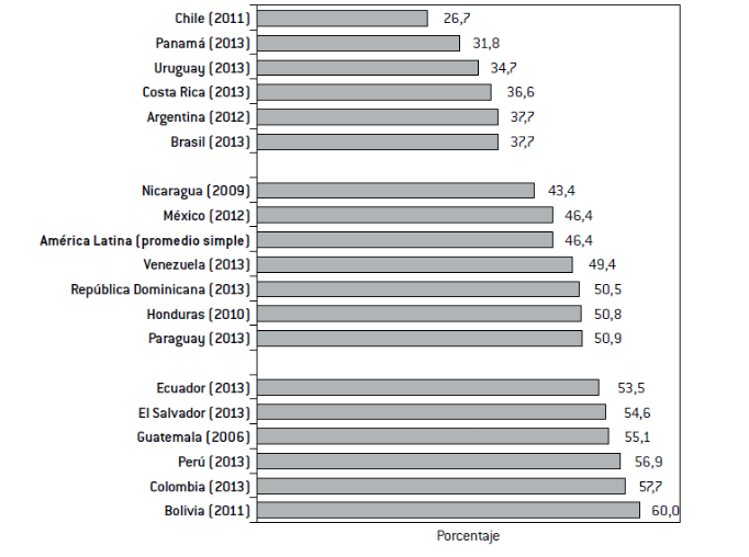 A pesar de estos debates sobre la vigencia de la conceptualización sobre la informalidad, la medición sobre la participación de trabajadores en el sector de baja productividad continúa brindando pautas que permiten diferenciar las particularidades de los países de la región. Según la información de la Gráfica 1, mientras que el promedio regional alcanza al 46,4%, la dispersión entre países es marcada y hace evidentes las diferencias entre el denominado “Cono sur”, integrado por Argentina, Brasil, Chile y Uruguay, con un promedio menor al 40% (particularmente Chile), a los que se suman dos casos testigo en Centroamérica: Costa Rica y Panamá; un grupo intermedio en la región central del continente, conformado por Nicaragua, México, Venezuela, República Dominicana, Honduras y Paraguay y, por último, un conjunto de países donde los ocupados en el sector informal superan al 51%, entre ellos Ecuador, El Salvador, Guatemala, Perú, Colombia y Bolivia.