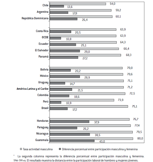 Dado que en el cuadro se representan tasas de actividad que abarcan a la población joven de entre 15 y 29 años de edad, las diferencias entre países pueden asociarse a diferentes factores, entre ellos, cabe destacar: 1) la tasa de matriculación en la educación secundaria superior y su efecto en el aplazamiento de la inserción laboral; 2) la extensión de la inactividad juvenil; 3) la persistencia de patrones de género de tradición patriarcal. Sobre el primero de los puntos, se puede observar, sobre todo en Argentina y Chile, una amplia correlación entre matriculación en la educación secundaria y disminución de la tasa de actividad, una tendencia sustantiva entre hombres y mujeres. En el otro extremo, en la región del Caribe, se observa una menor matriculación y mayor extensión de la actividad laboral de la juventud, sobre todo entre los varones jóvenes. En esta dirección, la persistencia de los patrones tradicionales de género se puede observar en la segunda columna de la Gráfica 2, donde se expresan las diferencias entre la participación laboral de hombres y mujeres jóvenes, poniendo de manifiesto que en aquellos países donde las tasas de participación masculina son más altas, las diferencias con las tasas de participación femenina son más profundas. Nótese que, como se plantea más adelante, en los países en los que la inactividad femenina es más pronunciada es donde se registra un porcentaje más alto de jóvenes en situación de inactividad absoluta, entre ellos El Salvador (26,8%), Honduras (29%) y Guatemala (28,7%), con una gran presencia en áreas rurales (Tornarolli, 2016).