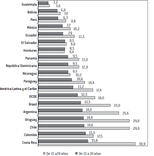 La Gráfica 3 muestra la situación de los y las jóvenes en relación con la tasa de desocupación abierta, en la que se vuelve a hacer evidente la necesidad de un análisis particular que destaque las características de las edades de quienes se están integrando al mercado laboral. En este caso, la tasa se presenta a partir de dos categorías etarias, una correspondiente al período entre 15 y 29 años, y otra al público adolescente (15 a 19 años de edad). En el primer caso, de la gráfica se desprende que para el conjunto de la región la desocupación alcanza al 11,2 % de la población joven, presentando valores análogos a los correspondientes a las naciones de la ocde (ocde, 2016), pero con una amplia diferenciación entre países. Por ejemplo, en Argentina, Brasil, Chile, Costa Rica y Uruguay la desocupación es notoriamente más alta, mostrando una correlación negativa respecto de la informalidad medida según la definición de la Comisión Económica para América Latina (cepal, 2014), como puede verse en la Gráfica 1. Asimismo, la vulnerabilidad de los jóvenes en países de la región central del continente, tales como Guatemala, Honduras y El Salvador, se expresa en la participación en tareas familiares no remuneradas. Y en las mujeres, en menores tasas de actividad abiertas, que se conocen asociadas a su amplia participación en actividades domésticas y de cuidado (Tornarolli, 2016).