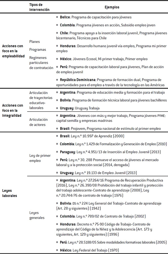 Aunque no se especifique la exclusividad de formación para jóvenes, la Ley Federal del Trabajo, de México, en 1970 estableció contratos de adiestramiento y capacitación de los trabajadores. Por otro lado, en Argentina la Ley n.º 26.390, de 2008, en el artículo 22 contempla este tipo de contratos entre empresas y jóvenes desempleados, que se comprometen contractualmente, en tanto el empleador certificará el aprendizaje. A su vez, con respecto a la Ley de Contrato de Trabajo, similar es la situación en Perú con la Ley n.º 28.518 sobre modalidades formativas laborales (2005), no obstante, se establece que las prácticas preprofesionales se darán dentro de centros de formación y que los estudiantes deben poder aplicar sus conocimientos en situaciones de trabajo concreto.
