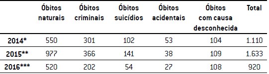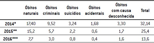 Ao se fazer a conversão de taxas para números absolutos, levando em consideração o incremento da população encarcerada no período (em 2014, 316.474 presos, excluídos os estados do Rio de Janeiro e São Paulo; em 2015, 643.066, excluído o estado do Rio de Janeiro; em 2016, 676.493 excluído o estado do Rio de Janeiro), temos o Quadro 2, através do qual se constata um aumento no número de mortes, as quais, em diferentes categorias, já no primeiro semestre de 2016 se aproximam dos números totais dos anos anteriores.