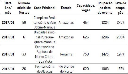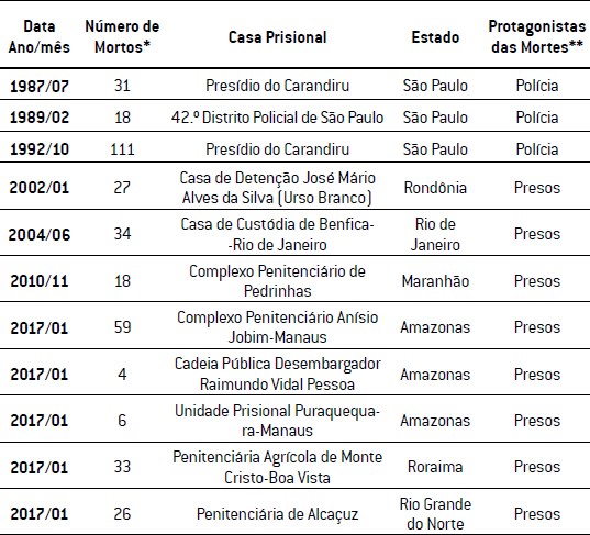 Após os eventos da Penitenciária de Alcaçuz, o Jornal Folha de São Paulo elaborou reportagem na qual apresentava aquelas que seriam algumas das rebeliões que deixaram mais mortes nos presídios do país. Os dados que compilamos relacionam eventos desde 1987 até 2017; 30 anos, portanto.