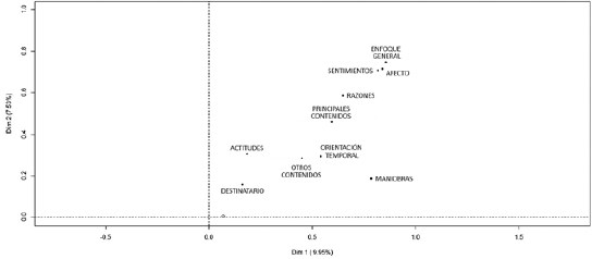El Gráfico 1 muestra el conjunto de variables con mayor poder explicativo de la variabilidad de los datos del conjunto integrado a la categorización. A partir de él se observa cómo tales variables combinan factores de carácter sentimental, actitudinal, cognitivo, temporal y social. Estas últimas variables se tratarán con mayor profundidad al examinar los resultados del ACM.