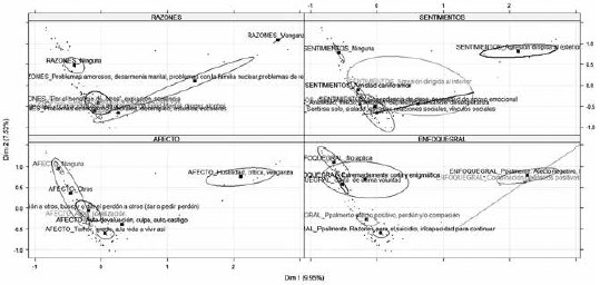 Por otra parte, surgen elementos de interés al poner el foco en las distancias entre categorías de las mismas variables. A modo de ejemplo, en la variable sentimientos la categoría agresión dirigida al exterior se distancia razonablemente de la categoría agresión dirigida al interior. En las razones proporcionadas, venganza se distancia de relaciones amorosas.