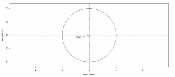 El Gráfico 3 muestra la relación de la edad con las dimensiones creadas por el ACM.4 Un elemento a destacar es la correlación con la dimensión 1, a pesar de estar trabajando con un grupo homogéneo, como lo es la población adulta. Por otro lado, se observa que la variable edad alcanza una correlación de -0,261 con la dimensión 1 y casi nula con la dimensión 2 (-0,069). De esta manera, existen elementos empíricos que permiten profundizar sobre las relaciones etarias y las conductas suicidas.