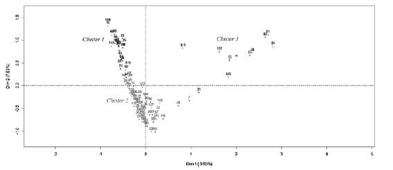 A partir del Gráfico 4 pueden identificarse 3 grupos o clústeres según los factores proporcionados por el ACM.
