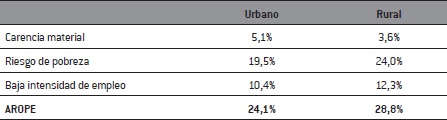 Un valor positivo en cualquiera de los tres indicadores implica un valor positivo en el AROPE. Los datos muestran que el indicador de rentas -riesgo de pobreza- es el que tiene mayor incidencia en la tasa de riesgo de exclusión: el 83,3% de quienes están en riesgo presentan valores de renta insuficientes. Como puede observarse -Cuadro 1-, la exclusión social es importante y es mayor en las áreas rurales donde más de la cuarta parte de los habitantes se encuentra en esa situación. La única excepción en la desigual relación rural-urbano viene del índice de carencia material, para el cual las áreas rurales, en comparación con las urbanas, tienen ventaja. El motivo principal para ello es la concentración en áreas urbanas de las situaciones de infravivienda y de pobreza más extrema.