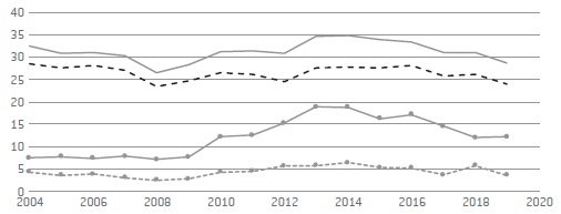 La evolución de los indicadores -Figura 1- muestra el importante efecto que ha tenido la crisis financiera de 2008. La Gran Recesión produjo un ascenso del indicador AROPE a cifras que en los años 2013 y 2014 llegaron a situar a más de la tercera parte de la población rural en riesgo de exclusión. La crisis supuso, además, un frenazo a la progresiva nivelación que venía observándose entre áreas urbanas y rurales por la destacable reducción de los valores de exclusión rural.
