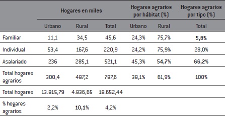 En la actualidad, las dos terceras partes (66,2%) de los hogares que guardan relación con la actividad agropecuaria son hogares en los que residen asalariados agrarios. La agricultura familiar en sentido estricto -en que al menos dos personas del hogar tienen ocupación agraria- roza, sin alcanzar, a un 6% de los hogares vinculados a la actividad agropecuaria. Dentro de la distinción clásica de la agricultura familiar como aquella en la que no existe vínculo salarial, encontramos la importancia que tienen los autónomos agrarios, que hemos incluido durante el análisis, junto a los productores familiares, en la misma categoría de productores agrarios.