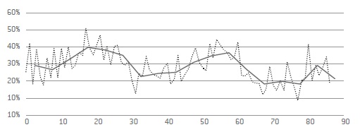 Los estudios han encontrado una relación inversa entre edad y exclusión (Tsakloglou y Papadopoulos, 2002). Es decir, hay más riesgo de exclusión en edades jóvenes que en edades mayores y esto es más acentuado en los países con un sistema del bienestar fuerte. El examen del riesgo de exclusión (AROPE) según la edad nos confirma este hecho -Figura 3-. El valor mínimo de exclusión se localiza en las edades más elevadas: especialmente entre los 65 y 80 años. Este dato enfatiza la importancia que tiene el sistema público de pensiones. Hay un segundo detalle también significativo. La distribución presenta una forma cíclica, con picos en las edades de 18 a 30 años y de 50 a 60, para situarse en mínimos entre los 30 y 50 años. El riesgo de exclusión se hace importante en los últimos años de la vida laboral, cuando la discontinuidad laboral se torna más prolongada, y también en los años jóvenes, cuando, por regla general, se produce una inserción precaria en los mercados laborales. Esto también hay que interpretarlo dentro del propio ciclo vital y de composición de los hogares. Así, el pico que alcanza el indicador de exclusión en jóvenes es efecto del crecimiento en términos de riesgo de la generación de sus padres, que empiezan a situarse en la cincuentena, con quienes conviven. A ello habría que sumar el mayor volumen de población de origen inmigrante en estas edades.