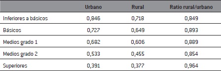 Si examinamos la variable que mayor incidencia ha mostrado en el riesgo de exclusión, el nivel de estudios, observamos -Cuadro 6- que las distancias entre los extremos -sin estudios y universitarios- son menos discriminantes en áreas rurales. La distancia entre universitarios y sin estudios en áreas urbanas es 0,846-0,391=0,455 y en áreas rurales 0,718-0,377=0,341. La mejora se produce principalmente en las categorías sin estudios. Es decir, para bajos niveles de estudios el medio rural resulta menos discriminante.