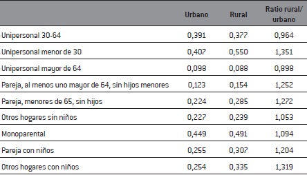 Es relevante que las diferencias y el impacto de la desigualdad aparezcan cuando consideramos las estructuras de hogar. Por una parte, nos habla de la mayor hostilidad que produce el hábitat respecto al desarrollo vital de los hogares, pero, por otra, también destaca el carácter resiliente que adquieren las estructuras familiares rurales y que ya habíamos advertido en estudios anteriores (Camarero y del Pino, 2014). El análisis realizado permite afirmar que para los perfiles de mayor exclusión la reducción del impacto que producen las áreas rurales puede explicarse por la colectivización de dichas diferencias en el interior de los grupos domésticos. Los grupos familiares que residen en las áreas rurales son fuertemente adaptativos y neutralizan, mediante las redes de apoyo y cuidados, el hándicap que supone la menor accesibilidad a los servicios de bienestar, pero también mediante las estrategias familiares de subsistencia consiguen absorber las condiciones de exclusión individuales. Por ejemplo, como ha señalado Pages (2011) para la Francia rural, mediante la extensión de la convivencia intergeneracional -hijos mayores con padres- o la vuelta de hijos al hogar doméstico para hacerse cargo de los padres.
