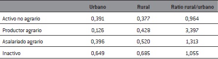 Los datos muestran que el riesgo de exclusión es más intenso en áreas rurales. El hecho de residir en un área rural supone incrementar en un 20% la probabilidad de exclusión sobre los habitantes urbanos. Es un valor relevante. Sin embargo, los hogares de los productores agrarios -categoría que puede ser interpretada como familia agraria- no aumentan su riesgo respecto al que tiene el conjunto de hogares activos. Como es esperable, es mayor y destacable el odd-ratio en asalariados agrarios y, evidentemente, en el conjunto de hogares inactivos, en cuyo caso el riesgo se hace tres veces mayor respecto al conjunto de hogares activos.
