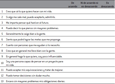 El bienestar psicológico se vincula con la valoración respecto a la forma de vivir. Fue medido a través de una prueba estandarizada (BIEPS-J), cuyo formulario puede verse en el Anexo (Tabla 8), que consiste en afirmaciones a las cuales cada persona debía contestar si estaba de acuerdo, en desacuerdo o ni de acuerdo ni en desacuerdo. La versión final fue elaborada con base en cuatro subdimensiones: