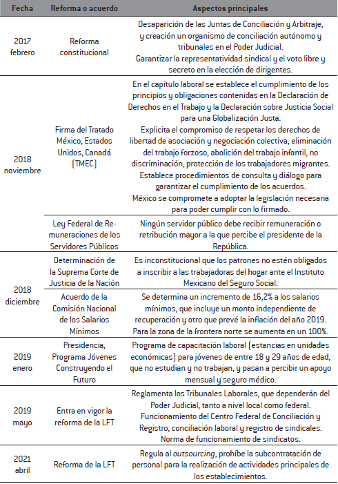 Desde su inicio, la nueva administración emitió acuerdos y elaboró programas que incidían en las relaciones laborales. En el cuadro 1 se sintetizan las principales reformas, los acuerdos y las acciones que fueron impulsadas desde el año 2017 y que a continuación se analizarán.