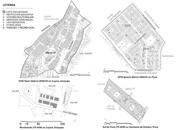 a) Una encuesta semiestructurada que permite conocer el perfil sociodemográfico de los ocupantes de la vivienda, las características de las viviendas, el entorno del barrio y las percepciones acerca de la vivienda que revelan actitudes y comportamientos. Durante el trabajo de campo realizado en 2017, considerando un universo de 1.828 viviendas en Piura, se encuestó una muestra representativa de 70 residentes de la Urbanización Sol de Piura (TP) y de la UPIS Ignacio Merino. En Arequipa, sobre un universo de 3.620 viviendas, se aplicó la encuesta a 72 residentes en el Proyecto Monte Verde (TP) y en la UPIS Dean Valdivia (ver figura 1).