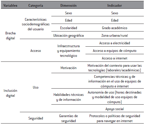 Para tal fin, las variables que se consideraron en el estudio fueron: brecha digital e inclusión digital, analizando en cada caso cuatro categorías que determinan el acceso, el uso y la seguridad de las TIC, las motivaciones para el uso de TIC y las habilidades técnicas para el manejo de dispositivos e información (tabla 1).
