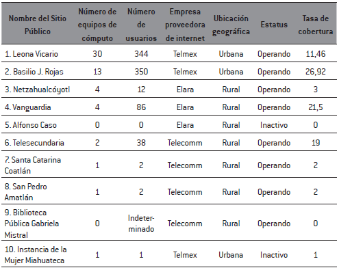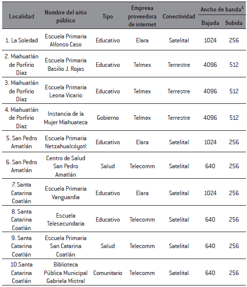 En el caso de los sitios públicos, de un total de 25 fueron seleccionados 10 como muestra. Al no haber un número de sitios proporcional según su tipología, se consideró el criterio de proveedor del servicio de internet (Telmex, Elara, Telecomm). Esto implicó la selección de al menos tres sitios por empresa proveedora del servicio, procurando que dentro de estos se incluyera al menos un sitio de cada tipo, es decir, se incluyeron sitios educativos, de salud, gobierno y comunitarios. Sin embargo, existe mayor número de sitios de tipo educativo, por ello, prevalecen en el estudio. Los sitios públicos estudiados y el número de usuarios entrevistados fueron seleccionados a través de un muestreo por conveniencia, considerando la localidad, el nombre del sitio, el tipo, la empresa proveedora de internet, el tipo de conectividad y el ancho de banda disponible (tabla 2).