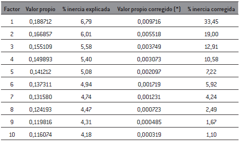 El modelo propuesto de ACM y factorial logró explicar prácticamente un 13% de la variabilidad de los datos. Pero al corregir según el algoritmo de Benzecri (1979) la primera dimensión ascendió a un 33,45% de la variabilidad explicada, mientras que la segunda dimensión alcanzó a un 19%. La variabilidad en su conjunto superó el 50%, siendo un indicador aceptable para proceder con la interpretación de la técnica. Estas dimensiones son las usadas para construir el mapa de correspondencias múltiples (gráfico 1). Tabla 3.