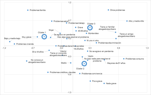 Una primera conclusión es que la distribución de eventos legales no sigue un patrón homogéneo y se presenta dispersa en el mapa de posiciones. Esto corresponde con perfiles de eventos característicos de los clústeres encontrados. El más interesante es el perfil n.° 1, compuesto predominantemente por mujeres de nivel socioeconómico bajo o medio-bajo, del interior y de edades medias. En este clúster, ciertos eventos aparecen en mayor proporción que en la población general: problemas de familia, trabajo y vivienda, especialmente. Además, estos eventos son considerados graves o muy graves en mayor proporción. En el otro extremo puede considerarse el grupo n.° 3, formado principalmente por personas de estrato medio-alto y alto, hombres y mujeres. En este caso están sobrerrepresentados los eventos de salud, trabajo, consumo, discriminación y la categoría otros. Estos eventos son considerados muy graves en menor proporción que en el total, pero también ocurre lo mismo con las categorías nada o poco grave.
