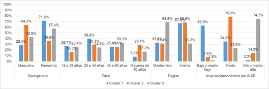 El conglomerado n.° 1 de personas se encuentra posicionado mayormente en el cuadrante -X +Y, de mayor complejidad y gravedad de los problemas. Se trata de los ciudadanos más postergados y vulnerables frente a la justicia. En su mayoría, son mujeres (71,6%), jóvenes (más del 65% menores de 44 años) y del interior del país (67%). También la gran mayoría (casi 63%) pertenece a los estratos más pobres. Por su parte, predominantemente en el grupo n.° 2 se encuentran aquellas personas en situación intermedia y con problemas de baja gravedad. Son en su mayoría varones (64,2%), del interior (más del 67%) y de clase media (78,3% estrato medio). No obstante, no se identifica un perfil etario preponderante. Por último, el perfil n.° 3, ubicado en el cuadrante +X +Y (problemas de discriminación o consumo considerados leves), está integrado por personas en su mayoría de Montevideo (68,8%) y varones (57,4%). El perfil etario de este clúster tampoco resulta nítido, aunque una leve mayoría (51%) tiene más de 45 años. Más del 74% pertenece al estrato socioeconómico alto y medio-alto.