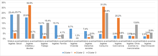 Con los diferentes conglomerados se buscó caracterizar no solo posicionalmente a las personas que viven determinados eventos legales, sino también de acuerdo con sus características porcentuales. El gráfico 2 ilustra estas diferencias, que se analizan a continuación con mayor detalle.