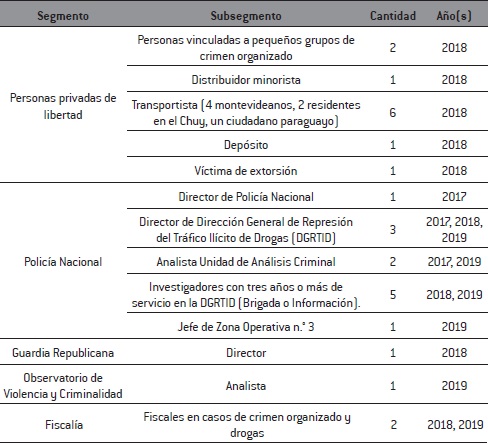 Para este artículo se sistematizaron 27 de dichas entrevistas a privados de libertad, policías, personal técnico del Ministerio del Interior y operadores judiciales. Las entrevistas fueron seleccionadas en función de su riqueza informativa y también en función del criterio de diversificación, que buscó triangular los discursos de actores ubicados en diferentes puntos del conflicto criminal. Este tipo de triangulación de la información es una estrategia metodológica valorada en el campo de estudios de crimen organizado y política de drogas (Reuter, 1986; Reuter y Haaga, 1989; Reuter, 2014).