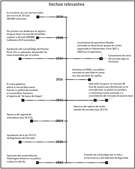 El año 2012 marca un evento especial: el narcotraficante Washington “Bocha” Risoto fue asesinado a plena luz del día en la calle por sicarios. Este crimen y otros relacionados con la competencia en los mercados de drogas, así como la alta fragmentación de la distribución en zonas acotadas de la ciudad, alertaron a la Policía y las autoridades.4 Fruto de la política seguida en años anteriores, en las cárceles uruguayas había traficantes extranjeros que entraron en contacto con delincuentes locales, quienes empezaron a vislumbrar el potencial que tenía dedicarse al tráfico de drogas. Este hecho, sumado a homicidios extremadamente violentos, generó movilizaciones por seguridad en 2012 y el presidente Mujica decidió reunir a un comité interministerial al que llamó Gabinete de Seguridad (integrado por los ministerios de Interior, Defensa, Desarrollo Social, Relaciones Exteriores, Salud y Educación y Cultura). Este gabinete elaboró el borrador de una estrategia, considerada integral, dirigida a disminuir los crímenes violentos en el país (Garat, 2014; Musto, 2017; Müller, Sienra y Draper, 2017). La regulación del cannabis surgió de este documento, entre otras medidas.