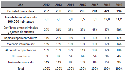 En la tabla 2 puede verse la evolución. Los homicidios catalogados como “conflicto entre criminales” y que mayormente, de acuerdo con las autoridades, están relacionados a los mercados de drogas, pasaron de 29% en 2012 a 50% en 2019. La clasificación de homicidios es realizada por el Observatorio de Criminalidad y Violencia del Ministerio del Interior con base en información policial del caso. Según narró un funcionario de dicho Observatorio, se toma un conjunto de indicadores para definir si el homicidio es debido a un conflicto criminal: