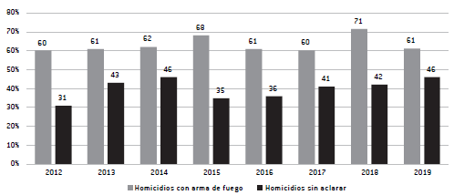 A partir de 2012 los homicidios con arma de fuego pasaron a ser mayoritarios, ubicándose desde entonces en entre 60% y 70% de los homicidios. Creció la cantidad de homicidios no aclarados, pasando de 31% a 46% entre 2012 y 2019. La mayor proporción de homicidios con armas de fuego y las altas tasas de impunidad son un rasgo distintivo de la violencia letal en América Latina. Estos factores parecerían incidir en la relación entre crimen organizado y violencia (Cano y Rojido, 2017; Garzón, 2016a). La prevalencia de homicidios con armas de fuego se asocia a que los grupos de crimen organizado tienen fácil acceso a armas a través de mercados ilegales y también por medio del acceso a armamento policial y militar. (Gráfico 1). Por su parte, las altas tasas de impunidad indican las limitaciones de la justicia para impedir los crímenes violentos (Garzón, 2016a).