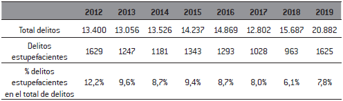 Mientras tanto, entre 2012 y 2018 los procesamientos por violación a leyes de drogas, es decir, a la Ley 14.294 (Uruguay, Poder Ejecutivo, 1974) y leyes modificativas, disminuyeron. Por tanto, estos delitos tienen que ver con tráfico, transporte, suministro, cultivo o producción, apoyo al narcotráfico, etc. Los homicidios que se producen en el marco de enfrentamientos entre grupos de crimen organizado quedan excluidos, porque no son violaciones a esta normativa (pese a que puedan tener su origen en mercados de drogas). Entonces, de acuerdo con cifras del Poder Judicial, los procesamientos por violación a leyes de drogas estuvieron en el entorno de un 3% de los procesamientos entre 1989 y 2000 (Brito, 2017). A partir de 2001 comenzó un leve crecimiento, que se ubicó en el entorno de un 4% de los delitos. Desde 2005 comenzó un crecimiento sostenido de los delitos por violación a leyes de drogas, que llegó a su máximo en 2012 (12% del total). Los delitos de estupefacientes procesados por la justicia tendieron a un comportamiento descendente a partir de 2013 hasta 2018, mientras que creció la violencia en estos mercados. (Tabla 3). Una interpretación posible es que no tendríamos más delitos relacionados con la dinámica de los mercados de drogas, sino mercados de drogas más violentos.