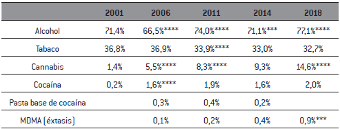 En los primeros quince años del siglo XXI se produjeron cambios en la demanda de drogas. El mercado de drogas se amplió entre 2001 y 2018, como puede observarse en la tabla 4. El consumo de alcohol, marihuana, cocaína y MDMA (3,4-metilendioximetanfetamina, también conocida como éxtasis) tuvo un comportamiento ascendente. El consumo de pasta base de cocaína habría tenido un estancamiento, el cual fue confirmado por un estudio más específico realizado por la JND en 2018. Según este estudio, en Montevideo y la zona metropolitana se habría experimentado un descenso en la cantidad de personas con uso problemático de pasta base, de 14.000 en 2012 a 8.800 en 2018 (Keuroglian, Ramírez y Suárez, 2019, p. 37). Por su parte, en 2013 se aprobó la regulación del cannabis mediante la Ley 19.172 (Uruguay, Poder Legislativo, 2013). La regulación se implementó con lentitud y recién en julio de 2017 se inauguraron farmacias, el canal que tiene más inscriptos (Baudean, 2021). Pese a ello, el acceso a través de los canales regulados, así como la difusión del cultivo de cannabis (registrado o no), quitó una parte del mercado al narcotráfico. Si bien no hay estimaciones precisas sobre volumen de producto legal y no legal consumido en Uruguay, las encuestas de la JND muestran que en 2018 63% de los usuarios conseguían marihuana por fuera de redes de tráfico (Junta Nacional de Drogas, 2019b, p. 126).