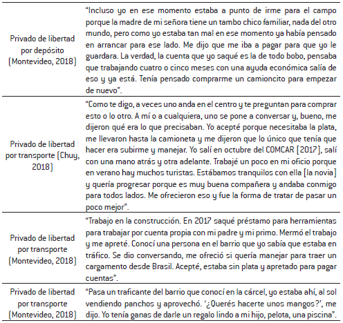 Uno de los elementos relevantes que surgió de las entrevistas a personas privadas de libertad por violación a leyes de drogas es el interés que genera involucrarse en el negocio porque permite tener ingresos atractivos, con una inversión de trabajo baja en términos relativos. El problema está en los riesgos que se enfrentan, pero las personas entrevistadas al momento de decidir involucrarse privilegiaron los ingresos frente a los riesgos. Entrevistas a personas que trabajaron en tareas como depósito o transporte (a nivel nacional o fronterizo) revelaron algunos elementos claves para entender cómo funciona la captación de personas para diversos trabajos relacionados con acopio, distribución y transporte.