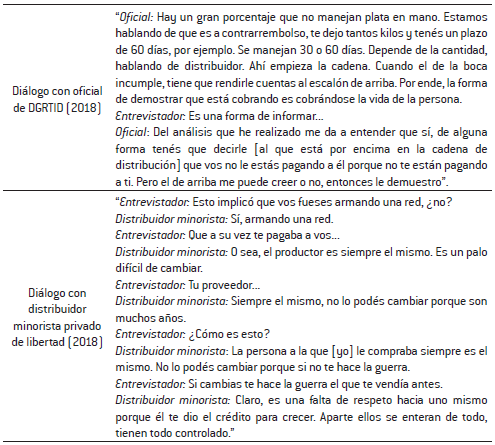 La integración vertical entre distribución y venta minorista fue otra consecuencia. La posibilidad de perder bocas de expendio a manos de la policía, así como la proliferación de robos entre bocas o a nivel de la distribución promovió una tendencia a la articulación entre distribución y venta minorista: los dueños de bocas buscaron reafirmar sus vínculos con el distribuidor minorista para tener protección. Asimismo, frente a la presión sobre la venta, los distribuidores buscaron asegurar un canal de salida para su producto. Esta articulación, que podía ser pacífica en otros contextos, podía promover la violencia porque generaba la necesidad de penalizar cualquier conducta que la desafiara. La cita del distribuidor que presentamos en la tabla 6 es elocuente.