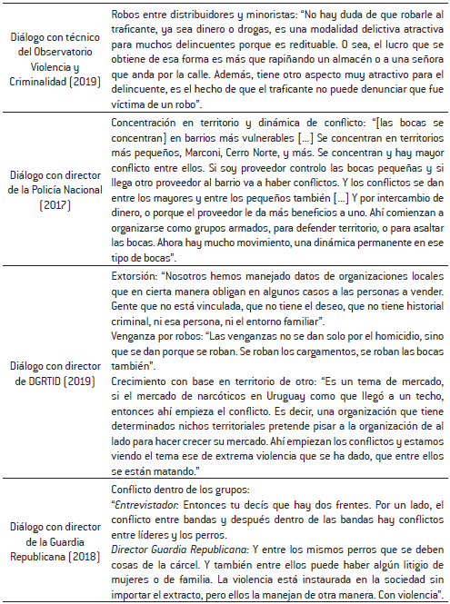 Los conflictos violentos se establecen a lo largo de toda la cadena de distribución: distribuidores minoristas, grupos que controlan bocas, propietarios de bocas, soldados de a pie de los distintos niveles de distribución y hasta consumidores se ven involucrados. En las entrevistas realizadas entre 2017 y 2019 tanto la policía como la fiscalía reconocían que los mercados de drogas evolucionaban hacia un equilibrio con altos niveles de violencia. Los altos mandos de la policía reconocían que la alta fragmentación en la distribución y los factores que promueven la violencia eran, en parte, consecuencia de una mayor eficacia de la policía en el control del delito, de un foco en el control del microtráfico y en la detención de líderes de organizaciones en la distribución mayorista y minorista (director de Policía Nacional, 2017; director de DGRTID, 2017 y 2018).