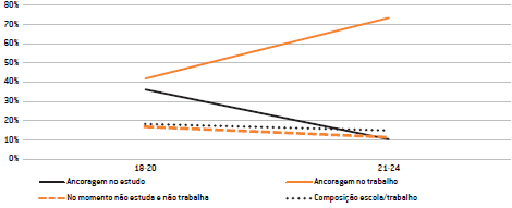 A análise que se segue, aborda as formas de ancoragem a partir de dois planos concomitantes. Primeiramente, pela identificação de mudanças nas ancoragens de uma sub-faixa de idade para outra (18-20 para 21-24). A isso denominamos de “evolução”. Assim, a evolução não se caracteriza pela análise do mesmo grupo ao longo do tempo, mas como um indicador do fluxo de ancoragem nos grupos de idade. Por outro lado, analisamos as variações, por sexo, raça/cor e grupo socioeconômico das evoluções dentro do grupo que compõe a faixa (18-24 anos).