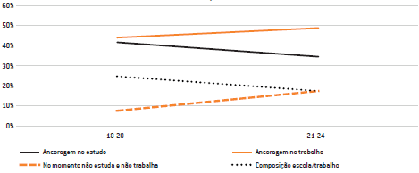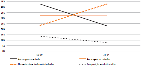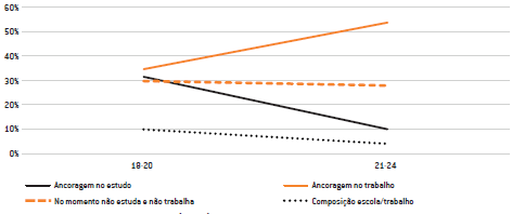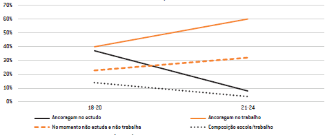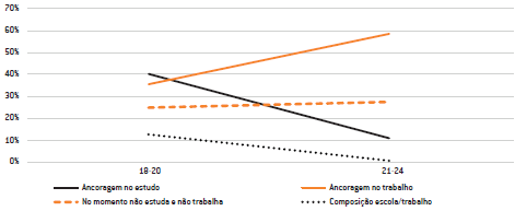 Entre homens, a grande mudança se dá entre uma significativa ancoragem nos estudos e no trabalho para uma forte ancoragem no trabalho e concomitante decréscimo da ancoragem nos estudos. Não aparecem mudanças significativas nem na dupla ancoragem (composição escola-trabalho), nem naquilo que indica frágil ancoragem nas duas instituições (no momento não estuda e não trabalha).