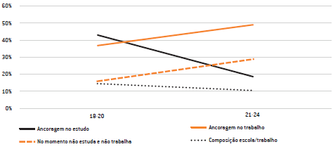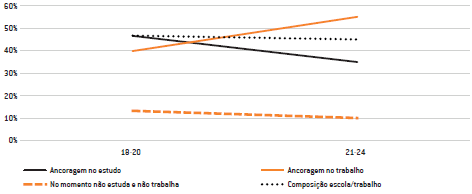A composição entre escola e trabalho (e, portanto, a dupla ancoragem) é algo que apresenta uma clara e significativa variação quando comparamos os GSE. A dupla ancoragem parte de percentuais que são mais altos quanto menor é a vulnerabilidade socioeconômica (entre os 18 e os 20 anos ela é de 46% entre as classes alta e médio-alta, e de 9,9% entre os pobres). Por outro lado, composição entre escola e trabalho não apresenta queda brusca em nenhum dos GSE, mostrando-se uma condição bastante estável em todos os grupos. Mas sua importância, sua expressão, varia muito entre os GSE, sendo alta, presente e estável nos estratos médios e altos, e significativamente mais baixa entre os estratos baixos e pobres, apresentando-se, nestes, quase que de forma residual.