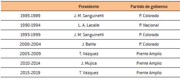 Los períodos 1990-1994 (de corte liberal, bajo la presidencia de Luis Alberto Lacalle Herrera, del Partido Nacional) y 2010-2014 (bajo la presidencia de José Mujica, del Frente Amplio) se distinguen por comportamientos del desempleo por debajo de la media de todos los períodos.