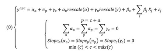 Donde 𝛼𝑎, 𝜋𝑝, 𝛾𝑐, los vectores de efecto edad, período y cohorte, respectivamente, reflejan el efecto no lineal de la edad, el período y la cohorte, ya que vienen con dos restricciones principales: cada vector suma 0 y tiene una pendiente de 0. Esto implica que estos vectores son nulos cuando la edad, los efectos de período o cohorte son lineales. Los términos 𝛼0𝑟𝑒𝑠(𝑎) y 𝛾0𝑟𝑒𝑠𝑐𝑎𝑙𝑒(𝑐) absorben las tendencias lineales. Rescale es una transformación que estandariza los coeficientes 𝛼𝑎𝑎𝑛𝑑𝛾𝑐: transforma la edad del código inicial 𝑎𝑚𝑖𝑛 a 𝑎𝑚𝑎𝑥 al intervalo -1 a +1 (Vera-Toscano y Meroni, 2021).