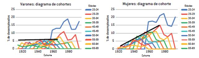 2. La desigualdad entre los desempleados no sólo puede deberse a la edad de los sujetos, sino que también está mediada por el período histórico (crecimiento o recesión económica, por ejemplo). Esto supone que algunas cohortes de nacidos puedan estar más afectadas que otras en la posibilidad de entrada o permanencia en el mercado laboral.