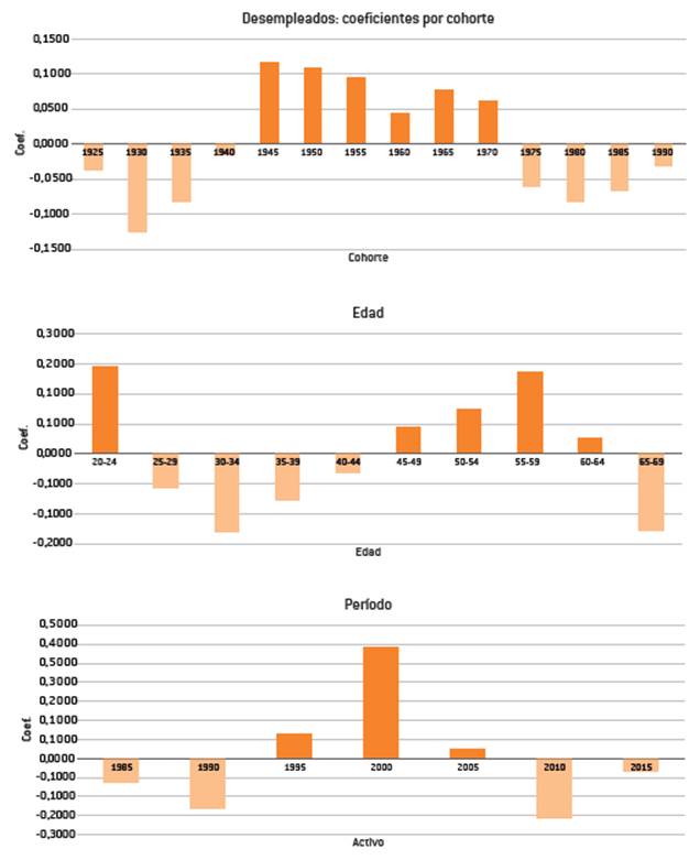 Utilizando el modelo APCD, estimamos el impacto de la edad, el período y la cohorte en el porcentaje de desocupados, a partir de la función: 1