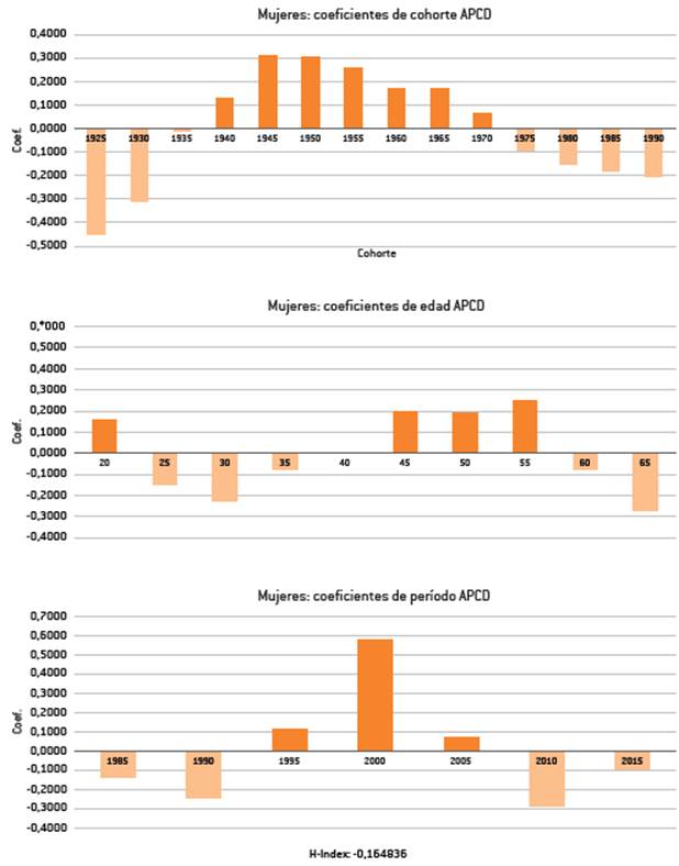 En la población femenina analizada, el H-index es de -0,164836, muy cercano a 0, lo que implica que el efecto cohorte se mantiene a lo largo de la vida de los sujetos que las integran (histéresis). El efecto cohorte es permanente, no se diluye ni aumenta a medida que los individuos de esa cohorte envejecen.